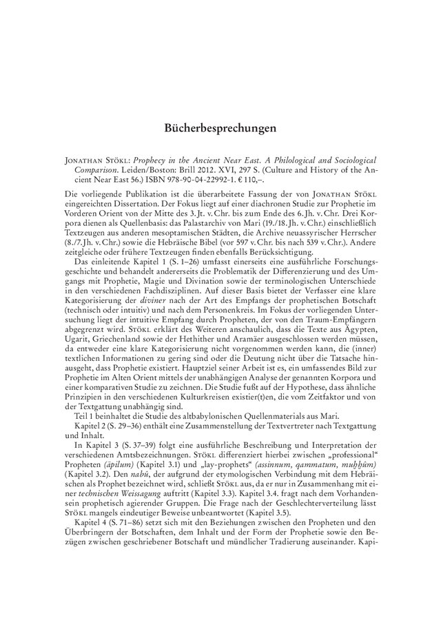 Jonathan Stökl: Prophecy in the Ancient Near East. A Philological and Sociological Comparison. Leiden/Boston: Brill 2012. XVI, 297 S. (Culture and History of the Ancient Near East 56.) ISBN 978-90-04-22992-1. € 110,–.