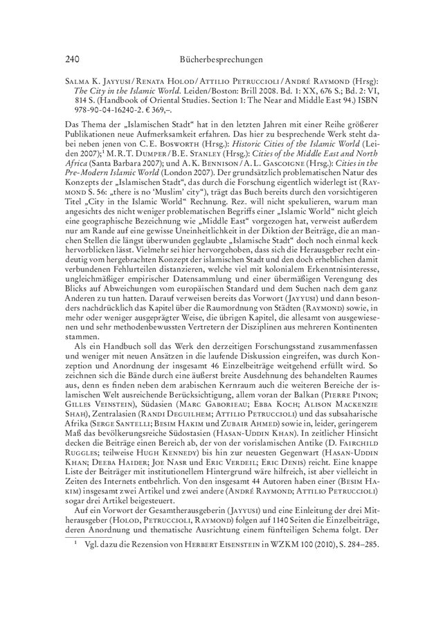 Salma K. Jayyusi / Renata Holod / Attilio Petruccioli / André Raymond (Hrsg): The City in the Islamic World. Leiden/Boston: Brill 2008. Bd. 1: XX, 676 S.; Bd. 2: VI, 814 S. (Handbook of Oriental Studies. Section 1: The Near and Middle East 94.) ISBN 978-90-04-16240-2. € 369,–.