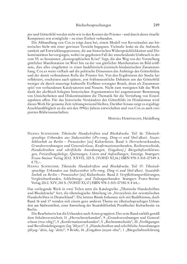 Hanna Schneider: Tibetische Handschriften und Blockdrucke. Teil 16: Tibetischsprachige Urkunden aus Südwesttibet (sPo-rong, Ding-ri und Shel-dkar). Staatsbibliothek zu Berlin – Preussischer [sic] Kulturbesitz. Band 1: Herrscherurkunden, Grundverordnungen und Generalerlasse, Konfirmationsurkunden, Rechtsentscheide, Handschreiben und schriftliche Anordnungen, Eingaben[,] Bürgschaftserklärungen, Freistellungsbelege, Quittungen, Listen und Aufstellungen, Sonstige. Stuttgart: Franz-Steiner Verlag 2012. XXVII, 325 S. (VOHD XI,16.) ISBN 978-3-515-07349-3. € 72,–.