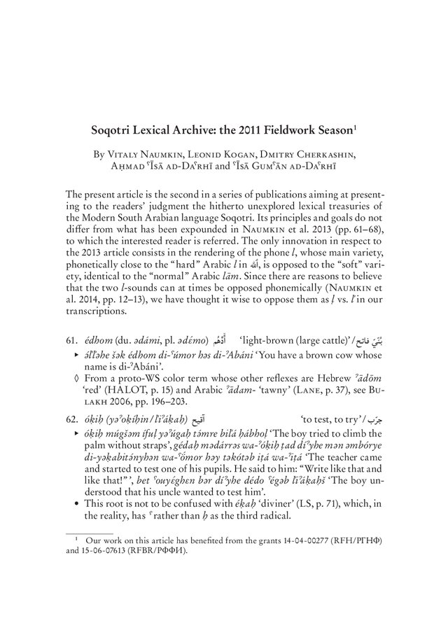 8 Naumkin, V. / L. Kogan / D. Cherkashin / A. I. ad-Daarhi / I. G. ad-Daarhi 2013: “Soqotri Lexical Archive: the 2010 Fieldwork Season.” In: ZDMG 163, pp. 61–85.