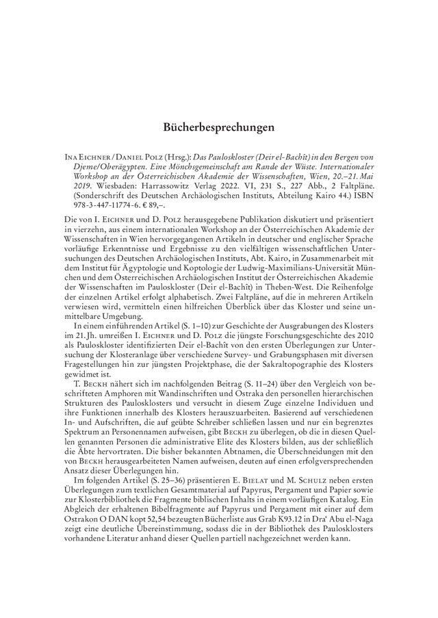Ina Eichner / Daniel Polz (Hrsg.): Das Pauloskloster (Deir el-Bachît) in den Bergen von Djeme/Oberägypten. Eine Mönchsgemeinschaft am Rande der Wüste. Internationaler Workshop an der Österreichischen Akademie der Wissenschaften, Wien, 20.–21. Mai 2019. Wiesbaden: Harrassowitz Verlag 2022. VI, 231 S., 227 Abb., 2 Faltpläne. (Sonderschrift des Deutschen Archäologischen Instituts, Abteilung Kairo 44.) ISBN 978-3-447-11774-6. € 89,–.