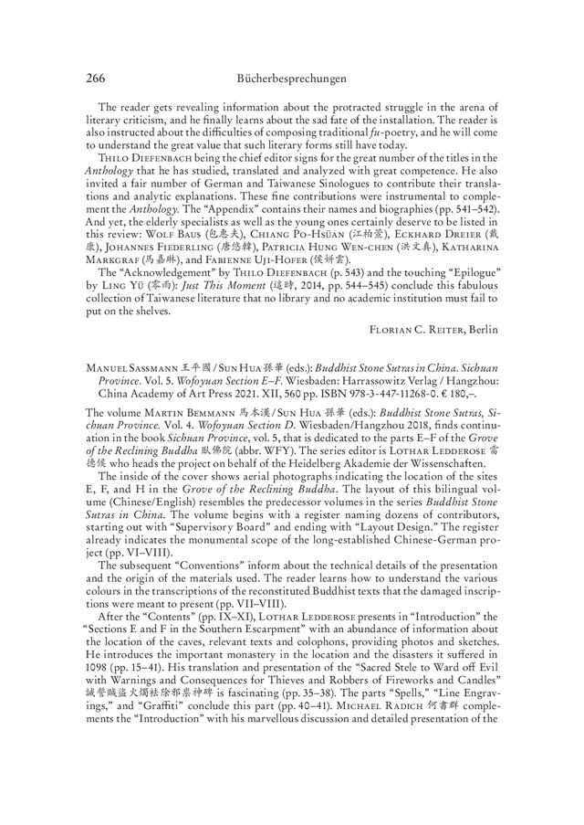 Manuel Sassmann 王平國 / Sun Hua 孫華 (eds.): Buddhist Stone Sutras in China. Sichuan Province. Vol. 5. Wofoyuan Section E–F. Wiesbaden: Harrassowitz Verlag / Hangzhou: China Academy of Art Press 2021. XII, 560 pp. ISBN 978-3-447-11268-0. € 180,–.